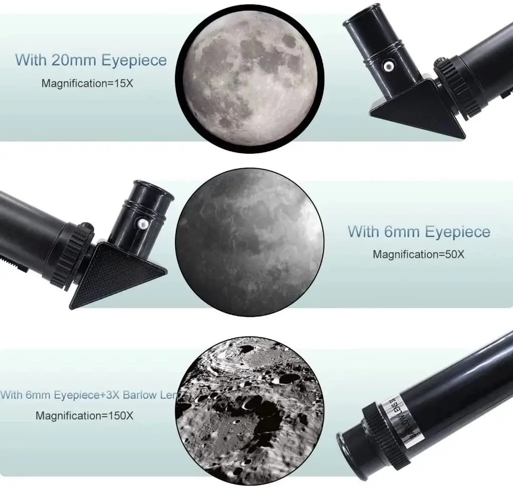 Yüksek Büyütme: 2 göz merceği (H20mm ve H6mm) ve 3X Barlow lens ile donatılmış teleskop. 3x Barlow lens, her bir göz merceğinin büyütme gücünü üç katına çıkarır, böylece çocuklar 15X'ten 150X'e büyütme elde edebilir. İster gezegenleri ister ayı izliyor olsun, teleskopumuz yetişkinler ve çocuklar için en iyi yardımcıdır. 812 yaş arası yetişkinler ve çocuklar ve astronomiye yeni başlayanlar için harika bir teleskop.