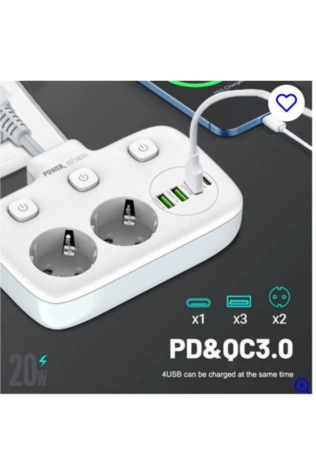 Akım Korumalı 2’li Ayrı Anahtarlı Priz, 2x Priz, 3x Usb, 1x Type-c, 2 Mt Kablo, Hızlı Şarj