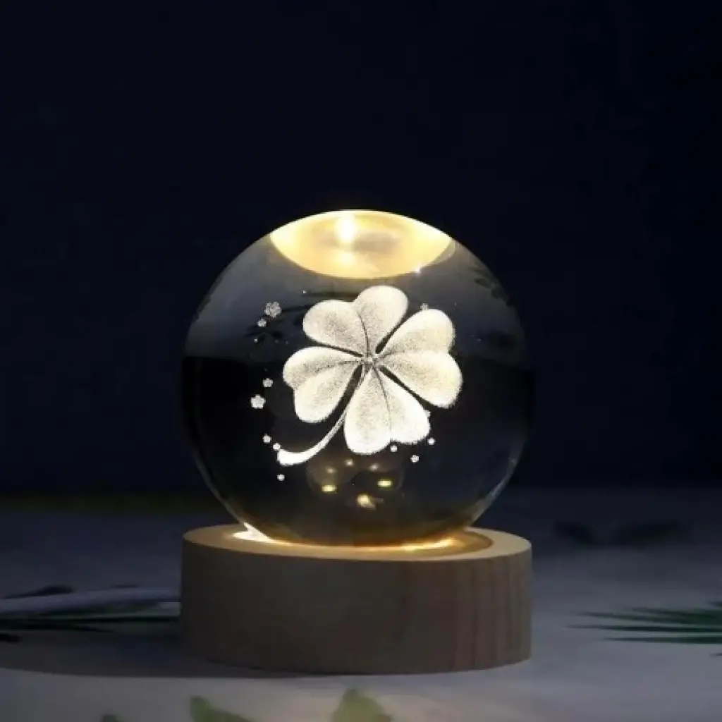 Dekoratif Yonca Tasarımlı Ahşap Altlıklı Işıklı Cam Küre Büyük Boy Cam:8cm Ahşap:2cm