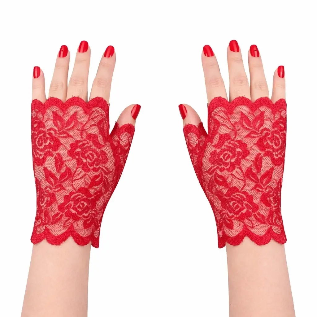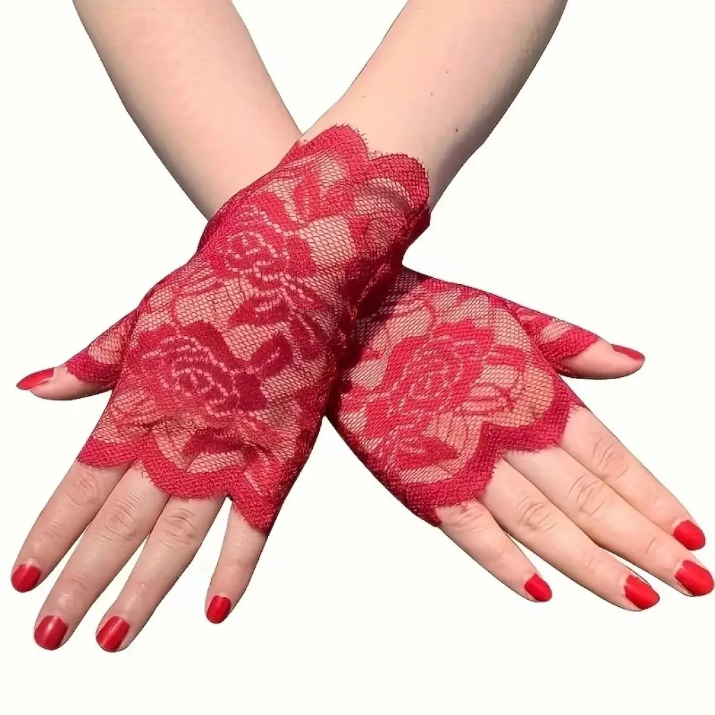 Zarif ve dikkat çekici tasarımıyla öne çıkan kırmızı gül desenli dantel parmaksız eldiven, özel günler, parti organizasyonları ve kostüm kombinleri için ideal bir aksesuardır. İnce dantel dokusu ve gül desenli tasarımı ürüne estetik ve şık bir görünüm kazandırır.