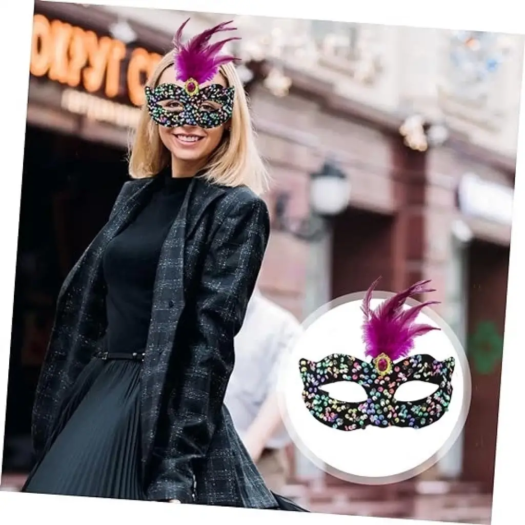 Siyah Kadife Üzeri Rengarenk Payetli Pullu Pembe Tüylü Pembe Taşlı Parti Maskesi: Gecenin Yıldızı Siz Olun